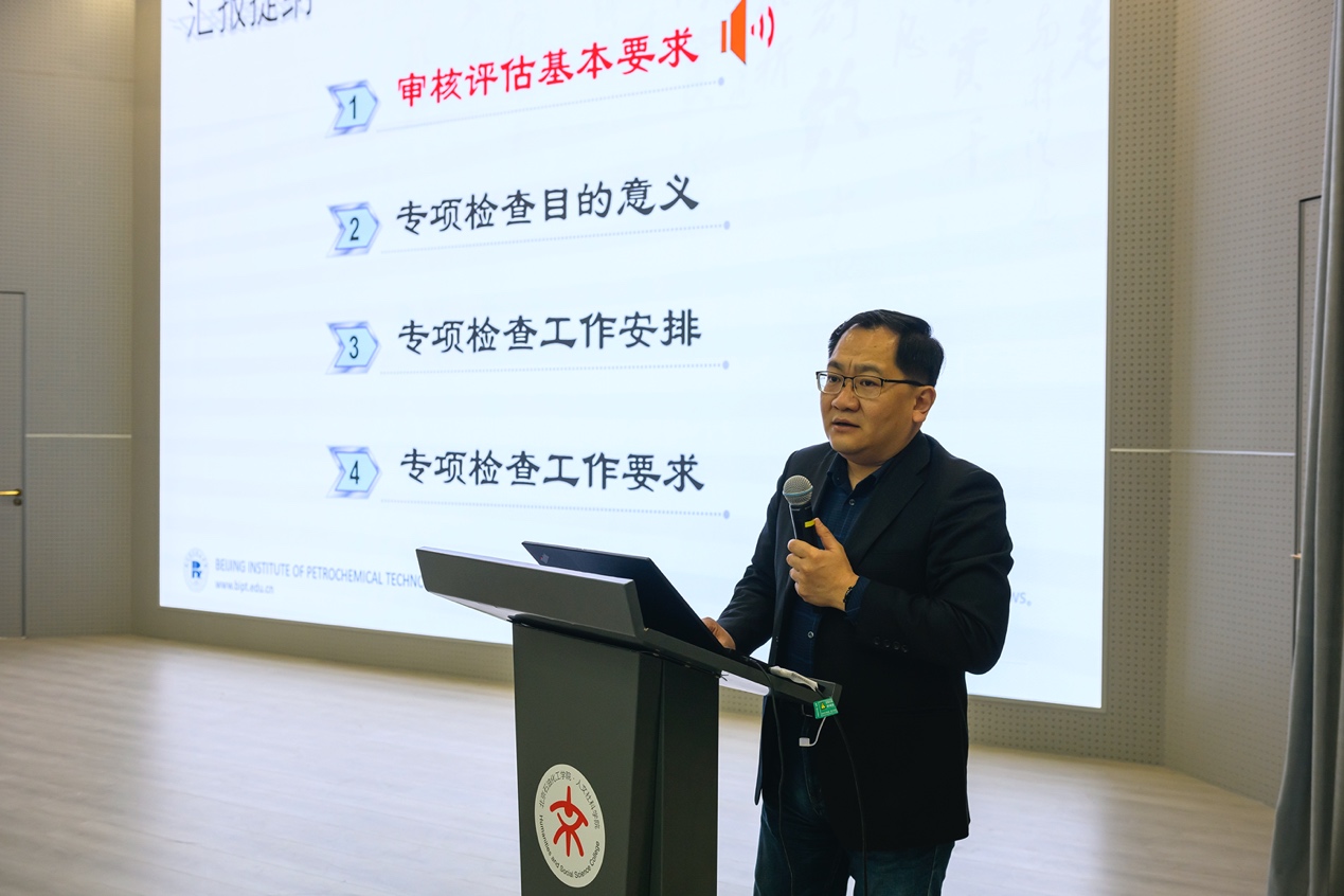 會上,王騰匯報審核評估專項檢查工作部署及檢查工作要點培訓,從基本要求、專項檢查目的意義、專項檢查工作安排、專項檢查工作要求四個方面展開,進一步明確了審核評估專項檢查的意義和工作內容,并對檢查的重點關注點予以強調。