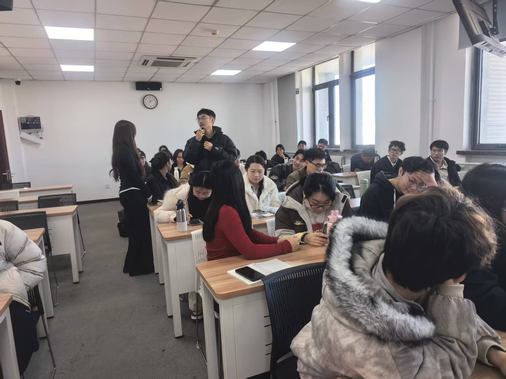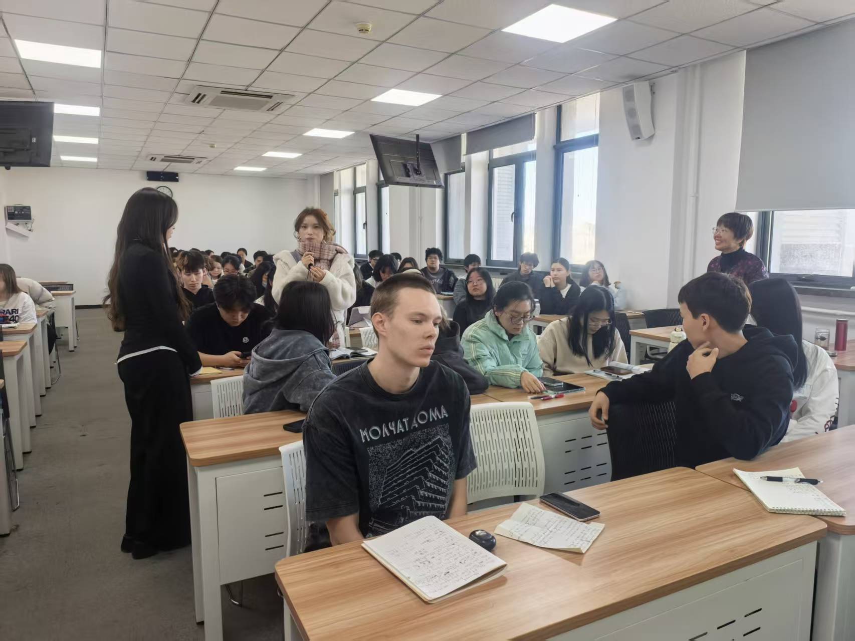 活動伊始,留學生代表率先登臺,以漢語、英語雙語結合的方式,生動介紹了各自國家的歷史文化、民族風情與特色美食。其中,關于俄羅斯布里亞特民族的信仰習俗、地域美食等分享極具特色,讓在場中國學生直觀感受到異域文化的獨特魅力。分享結束后,中國學生踴躍提問,圍繞布里亞特民族文化、中外生活差異以及留學生來華后的所見所感等話題展開深入交流。同時,中國學生也紛紛熱情的介紹自己的家鄉美景、傳統美食,向留學生推薦中國旅游勝地,并主動提出愿意在節假日擔任向導,希望在相互助力語言學習交流中結交志同道合的朋友。