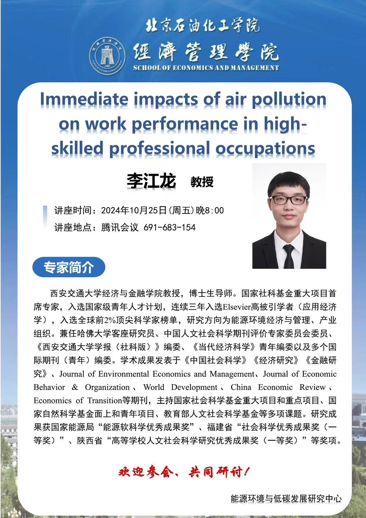 學術講座通知:Immediate impacts of air pollution on work performance in high-skilled professional occupations