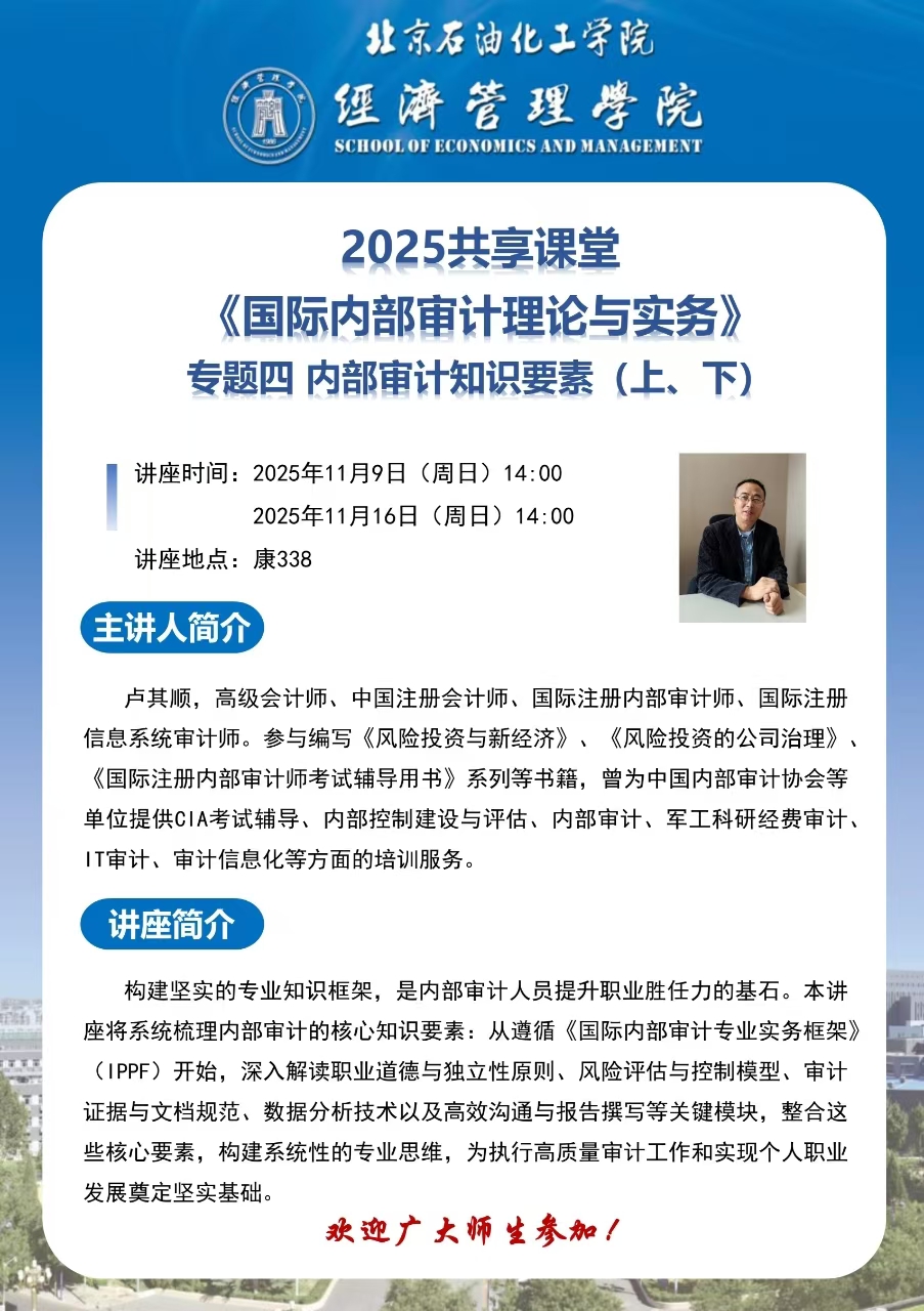 講座通知:2025共享課堂《國際內部審計理論與實務》專題四 內部審計知識要素(上、下)