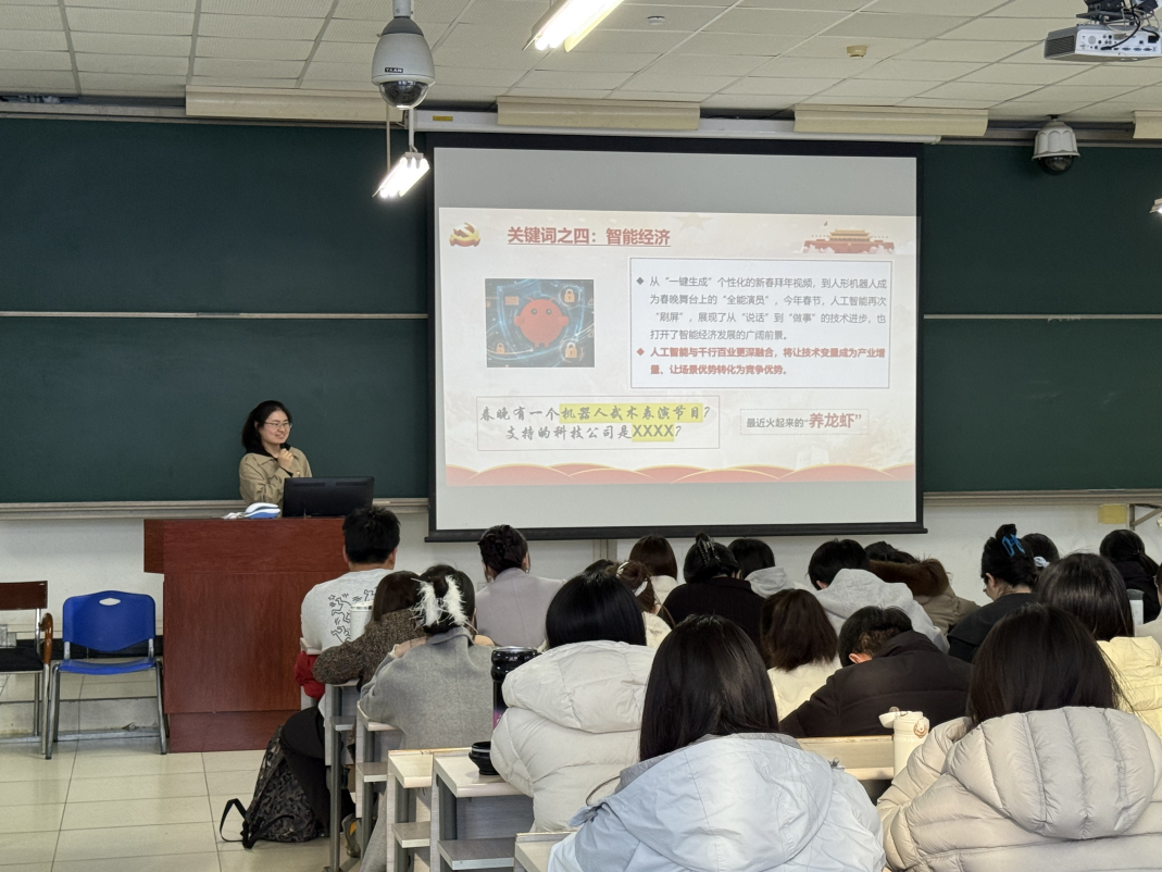本期“工研論壇”聚焦三大環節。第一環節“學理論”由李園園同學領學。她以互動提問開場,引導同學們思考兩會的含義,并系統介紹了2026年全國兩會的基本情況,重點解讀了五大關鍵詞:十五五開局、積極有為、投資于人、智能經濟、投融資綜合改革。結合兩會精神,她進一步分析了國家宏觀政策導向與研究生科研方向的契合點,鼓勵大家將理論學習融入專業研究,在服務國家戰略中找準定位。