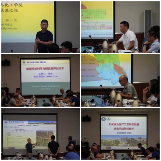 成果對接交流環節,伍一波教授集中介紹了化工材料領域的新成果,張偉教授詳細講解了“氫能研究中心”的能源高效利用及新能源開發技術,黃松濤副教授、劉昱副教授和胡守濤博士也分別介紹了基于高頻脈沖交流電場的劣質原油電脫鹽技術及其工程應用、工業控制系統信息安全防護及應用、石化企業生產工藝及實驗室安全風險防控技術。針對能源、材料和安全生產等領域的新技術、新產品和新工藝,校企雙方開展了面對面的熱烈討論和交流。