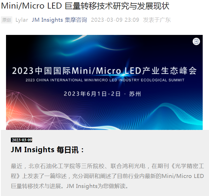2023年1月25日,機械工程學院劉強教授團隊與北京航空航天大學、天津工業大學、廣州市鴻利光電股份有限公司的最新合作研究成果“Mini/Micro LED 巨量轉移技術研究與發展現狀”發表于《光學 精密工程》31卷第2期上。論文充分調研和闡述了目前行業內最新的Mini/Micro LED巨量轉移技術與進展,發表后于2023年3月9日被新型顯示產業咨詢機構JM Insights轉載宣傳報道。機械工程學院王偉副教授、機研20趙甜甜同學分別為第一作者和第二作者,劉強教授為論文通訊作者。