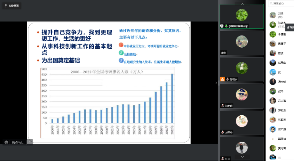 接下來,李建剛副院長結合大量數據對近幾年學院學生考研情況進行了分析介紹。他指出,要從低年級開始鼓勵學生繼續深造,早日定下考研目標,之后結合不同時期給予學生及時指導,包括基礎課準備、學校選擇等等。同時,圍繞考研定期舉辦考研輔導、考研交流等多種活動,群策群力,一起營造良好的考研學習氛圍,不斷提升考研成功率。