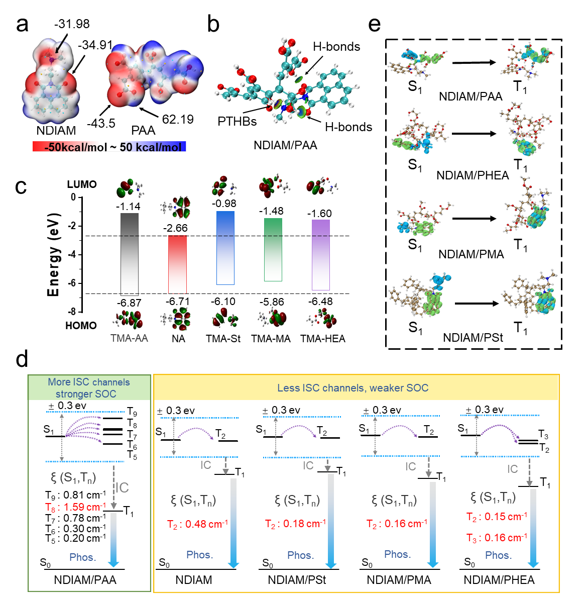 圖4:理論模擬計算驗證質子轉移氫鍵在阻斷光誘導電子轉移、促進系間竄越起到關鍵作用。a. NDIAM的叔胺和羧基之間存在強分子間相互作用;b. NDIAM/PAA間以吸引作用和范德華力為主,且羧基與叔胺形成PTHBs、羧基與羰基形成分子間氫鍵;c. HOMO-LUMO能級分析表明,AA可通過PTHBs改變叔胺的能級分布,抑制PET效應引發的S?非輻射弛豫,而St/MA/HEA無此作用;d. NDIAM/PAA在S?能級±0.3eV范圍內有更多ISC通道且SOC常數更大,顯著促進ISC;e. NDIAM/PAA中S?和T?態的空穴和電子轉移至PAA,發生電荷轉移,促進ISC并降低非輻射弛豫常數,延長磷光壽命。