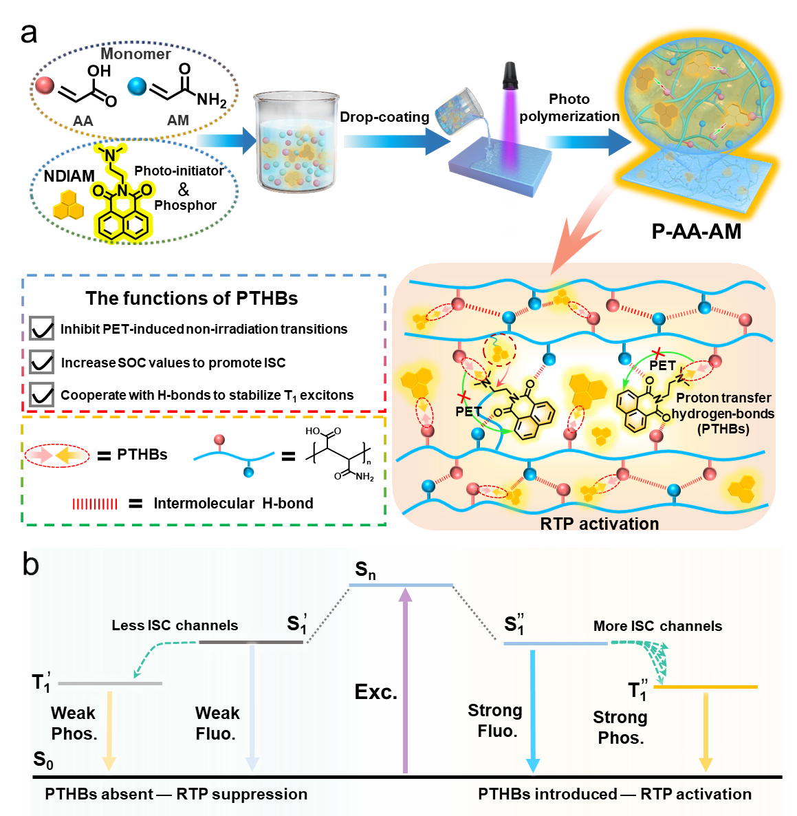 圖1. 萘酰亞胺光固化RTP材料的制備過程及其調控機制示意圖。