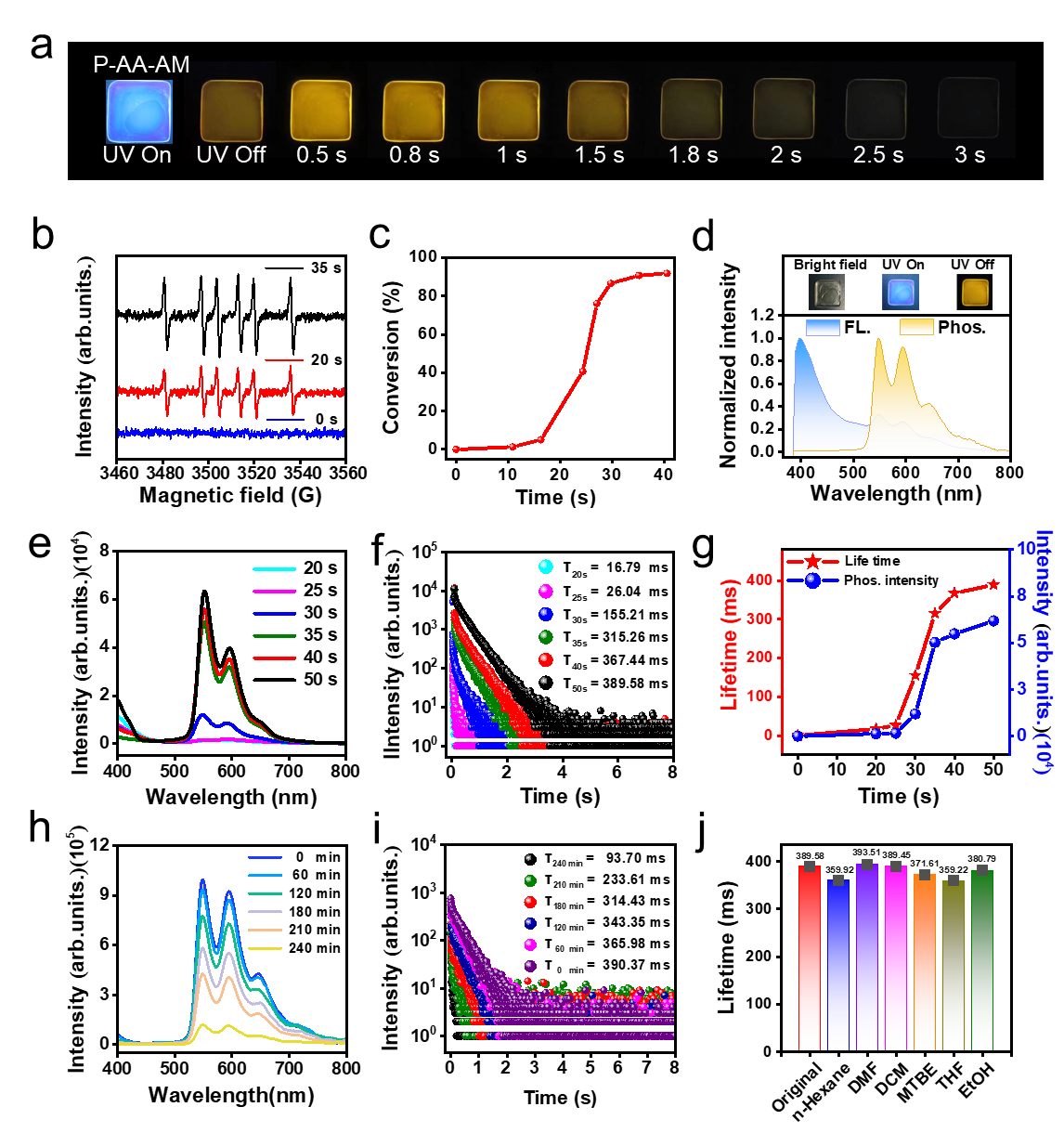 圖2:光固化RTP的光學性能測試。 a. P-AA-AM薄膜的余輝照片;b. 紫外光照射下NDIAM產生自由基;c. 光固化40 s后雙鍵轉化率達~91.80 %;d-g. 隨光固化時間延長,P-AA-AM的RTP強度和壽命顯著提升,50s時壽命達389.58ms;h, i. 材料在水中浸泡210min仍保持良好RTP性能;j. 在n-Hexane、DMF、DCM等多種有機溶劑中浸泡45天,RTP壽命和強度無明顯變化,證實其優異的耐溶劑性。