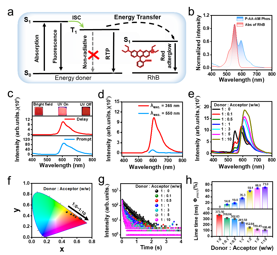 圖5. 利用磷光共振能量轉移原理,實現余輝顏色從黃色到紅色的連續調控。 a. TS-FRET過程示意圖,P-AA-AM作為能量供體,RhB作為能量受體;b. P-AA-AM的磷光光譜與RhB的吸收光譜高度重疊;c-d. P-AA-AM/RhB存在高效的TS-FRET過程,間接激發下有強延遲發射,直接激發下RhB無明顯延遲發射;e-g. 隨RhB負載量增加,P-AA-AM的550nm延遲光譜強度逐漸減弱直至消失,發射峰紅移至614 nm,余輝從黃色變為紅色,且磷光壽命從373.50ms降至108.40ms;h. TS-FRET效率隨RhB負載量增加逐漸提升至71.0%。