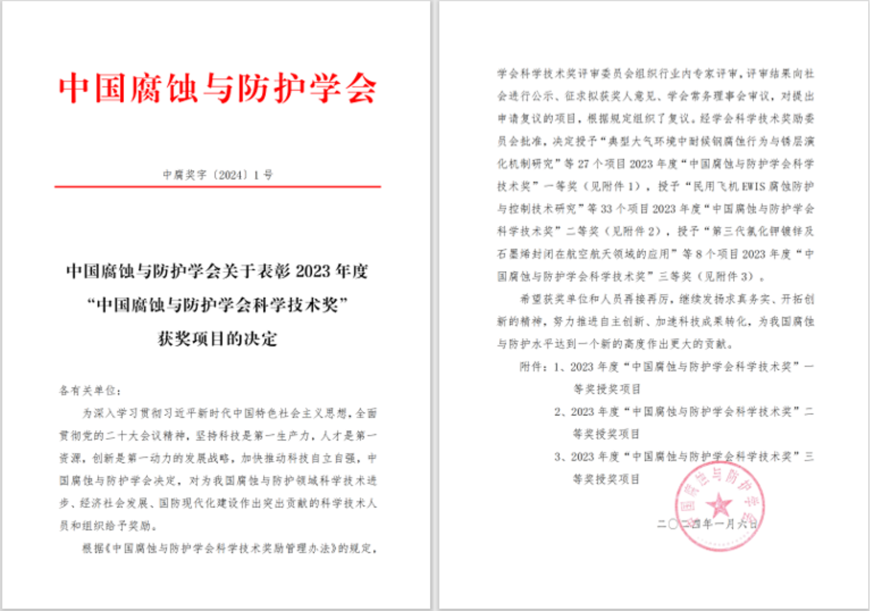“中國腐蝕與防護學會科學技術獎”是經國家科技獎勵工作辦公室批準、在國家獎勵主管部門注冊備案的中國腐蝕與防護學會設置的權威獎項,授予在腐蝕與防護科學研究和技術開發活動中完成的重大科學技術工程、計劃、項目或重大技術發明的項目。該獎項每年評選一次,本年度學會共向70個項目授獎,其中一等獎27項(含基礎/應用基礎類項目9項),二等獎35項,三等獎8項。