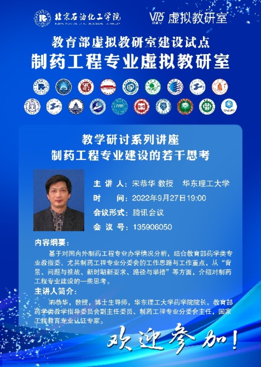 為貫徹落實教育部《關于加快推進虛擬教研室試點建設工作的通知》的工作要求,由北京石油化工學院牽頭的制藥工程專業(yè)虛擬教研室在前期工作的基礎上組織開展系列教學研討活動。2022年9月27日,制藥工程專業(yè)虛擬教研室組織首場專業(yè)建設教學研討會,由虛擬教研室專家委員會主任、教育部高等學校藥學類專業(yè)教學指導委員會副主任委員、華東理工大學藥學院院長宋恭華教授以《制藥工程專業(yè)建設的若干思考》為題作專題報告。