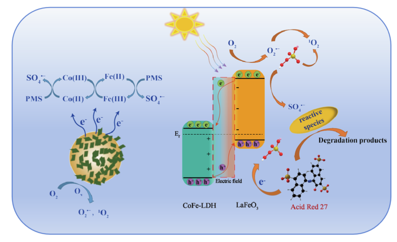 基礎化學教學與實驗中心馬磊副教授和谷慶陽副教授利用光催化偶聯過硫酸鹽氧化技術在廢水處理研究方面取得新進展,相關研究成果撰寫的學術論文《Layered double hydroxide helps LaFeO3 photocatalyst activate peroxymonosulfate to efficiently degrade dyes》,發表在國際知名期刊Separation and Purification Technology,2024,341:126832(1區TOP期刊,影響因子8.6)。由層狀雙氫氧化物(LDH)和鑭鐵氧體(LFO)組成的新型催化劑(LDH@LFO),在最佳條件下,催化劑在20分鐘內實現了染料AR27 93%的去除,與傳統的光催化或單獨的過硫酸鹽氧化相比,降解率提高了至少1.6倍。通過批量比較試驗、氧猝滅試驗和電子順磁共振對其機制的研究,闡明了反應機理為單線態氧和光生空穴起主要作用,其中Co和Fe氧化還原循環對LDH的激活至關重要。這項研究提出了一種新的異質結光催化劑的設計方案,為減輕環境污染問題提供了新思路。