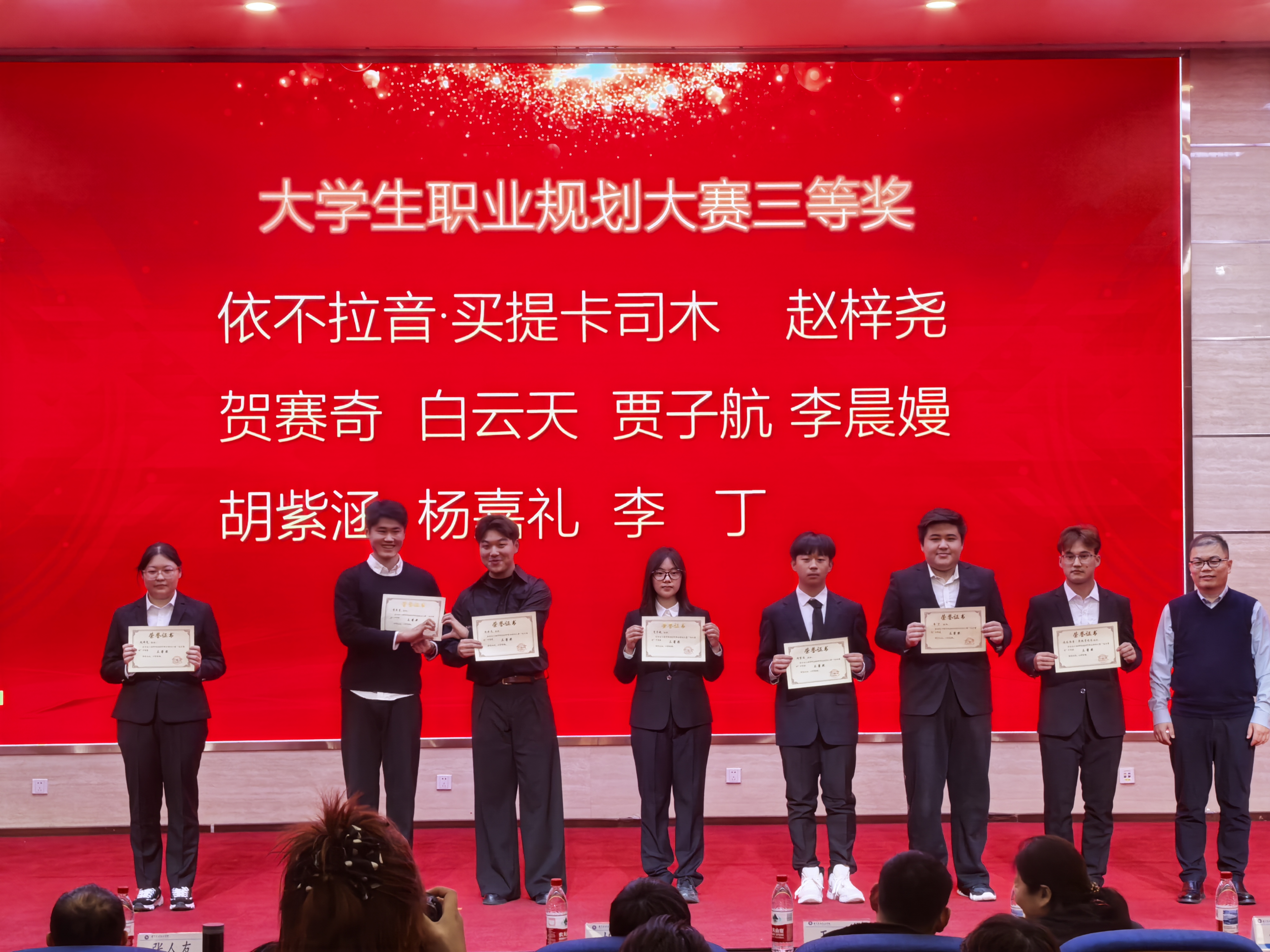 表彰環節作為大會的核心篇章,見證著榜樣的榮光。獲得先進個人和優秀副班主任榮譽稱號、院大職賽獎項的同學依次上臺接受頒獎。聚光燈下,他們接過燙金的榮譽證書,臉上洋溢著自信喜悅的笑容。臺下掌聲雷動,這是對獲獎者不懈拼搏的肯定,更是安工學子見賢思齊的共鳴。